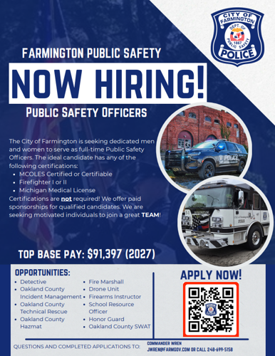 The City of Farmington is an Equal Opportunity Employer. All applicants must meet the current selection and hiring standards of the Michigan Commission of Law Enforcement Standards (MCOLES) and the Michigan Fire Fighters Training Council (MFFTC). Members must have attained a minimum of an Associate Degree or its equivalent in credit hours if pursuing a more advanced degree.