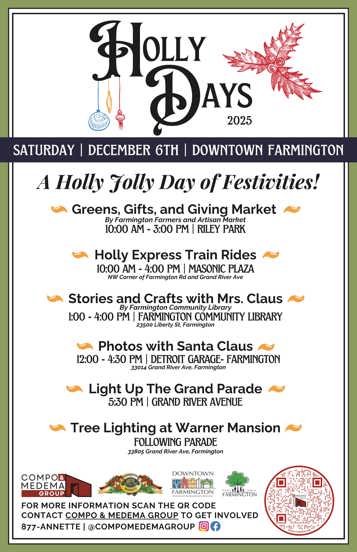 🎄Farmington’s Holly Days is a cherished one-day tradition that brings festive cheer to the heart of our community! Held on the first Saturday in December, this annual celebration transforms Downtown Farmington into a holiday wonderland — featuring a special Farmers & Artisans Market, seasonal activities, and the Light up the Grand Parade on Grand River Avenue. It’s a joyful day filled with hometown spirit, twinkling lights, and holiday magic for all ages!